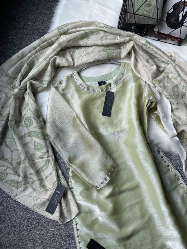 We used digital printed weightless georgette dupatta. We used premium dubai see through silk fabric for the kameez and pant and used butter for the inner.