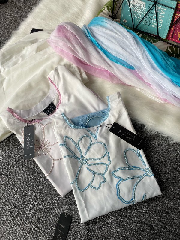 Pink shades and sky shades with floral pearls work three piece set only available at - Kurtiistic.