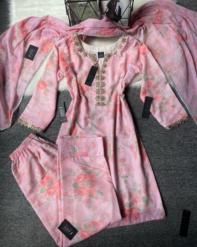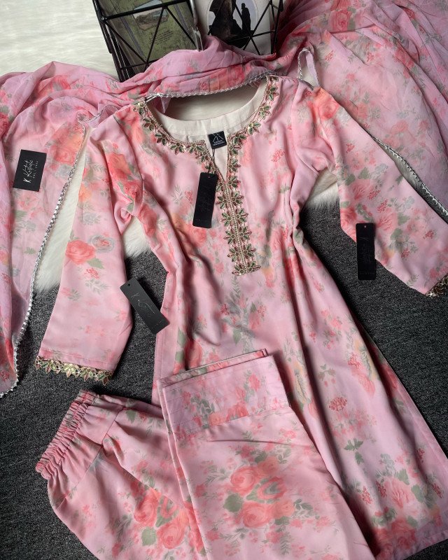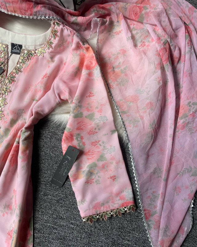 We used premium weightless digital printed georgette for the kameez pant and dupatta & we used butter fabric for the kameez and pant inner. Dupatta has silver-white lace work all over the corners. And the kameez has premium lace work on the neck and sleeves.