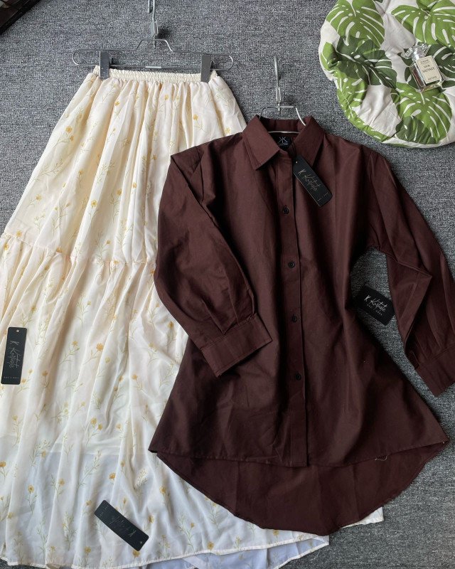 The outfit features a rich brown cotton shirt paired with a soft digital-printed georgette skirt, making it a balanced fusion of boldness and softness. The brown shirt gives a refined, grounded tone that perfectly complements the light ivory floral skirt, creating a look that’s both timeless and trendy. The shirt is tailored with a longer back (34 inches) and front length of 28 inches, giving a flattering high-low silhouette that suits all body types. With full sleeves and breathable cotton fabric, it ensures all-day comfort while maintaining a classy appearance.