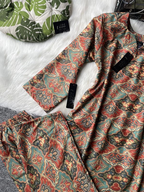 What makes this set truly stand out is its uniform print coordination between the dress and pant, creating a sophisticated co-ord effect that is both trendy and timeless. Whether you’re heading to a casual outing, a friendly get-together, or simply want to stay effortlessly stylish at home, this set is versatile enough to adapt to your day.