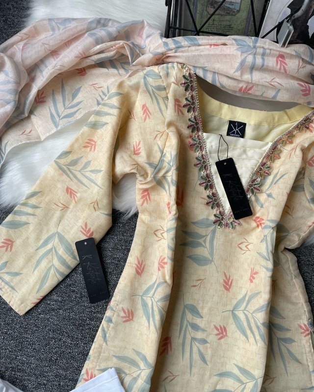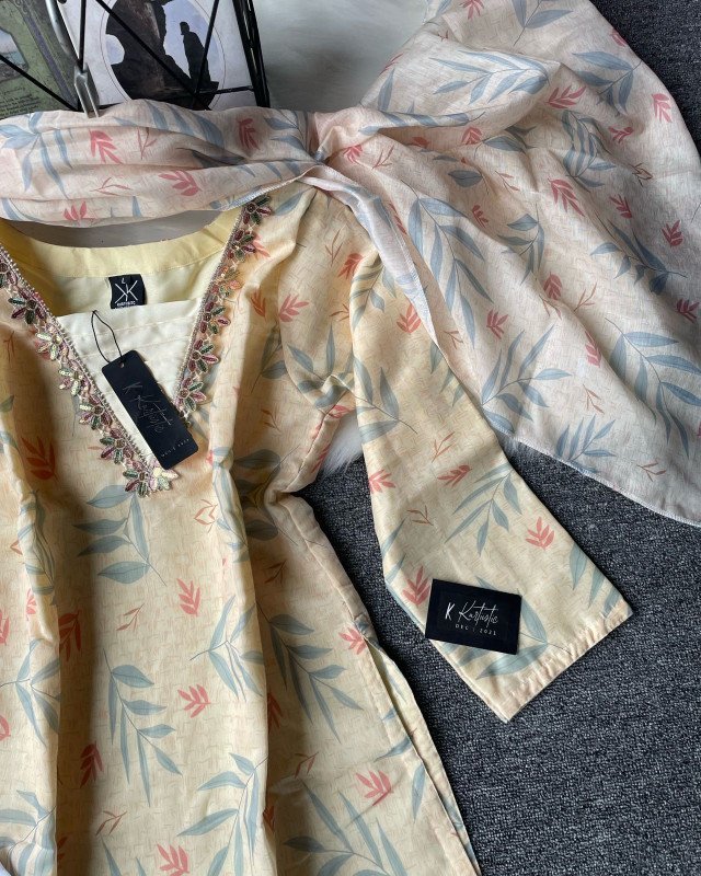 The kameez comes in a soft beige base, adorned with delicate leafy prints in pastel shades of blue and coral, giving it a refreshing and graceful appearance. The neckline is styled in a V-shape with intricate embroidery and beadwork, which elevates the entire outfit from simple casual wear to semi-formal elegance.