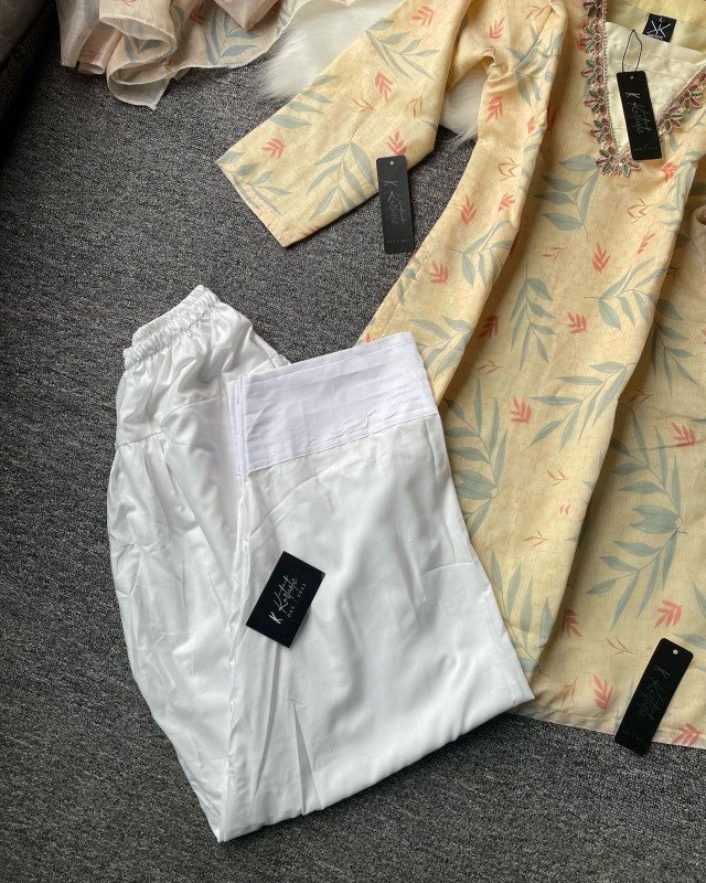 The sleeves are kept three-quarter length, balancing practicality with style. The straight-cut silhouette makes it versatile for different body shapes, providing a naturally flattering look. The trouser, in pure white cotton, creates a crisp contrast with the beige printed kameez. The dupatta mirrors the leafy prints, completing the set with harmony and elegance.