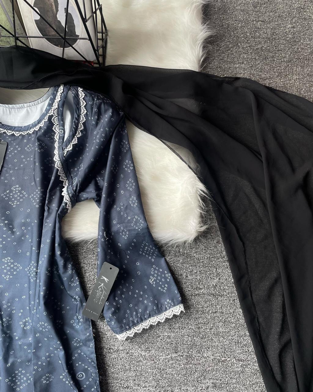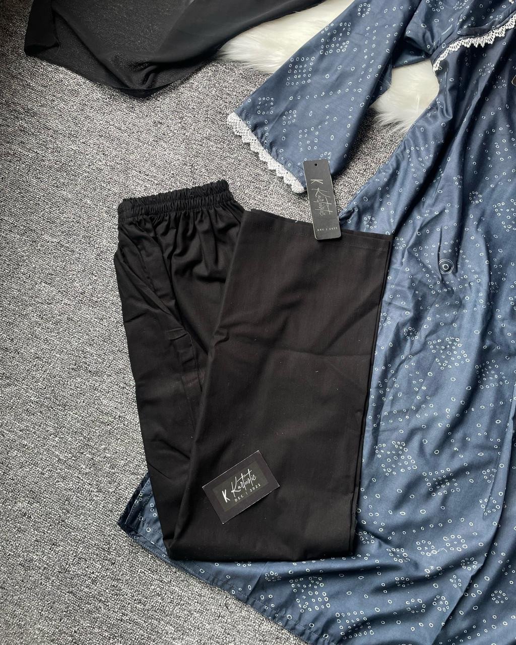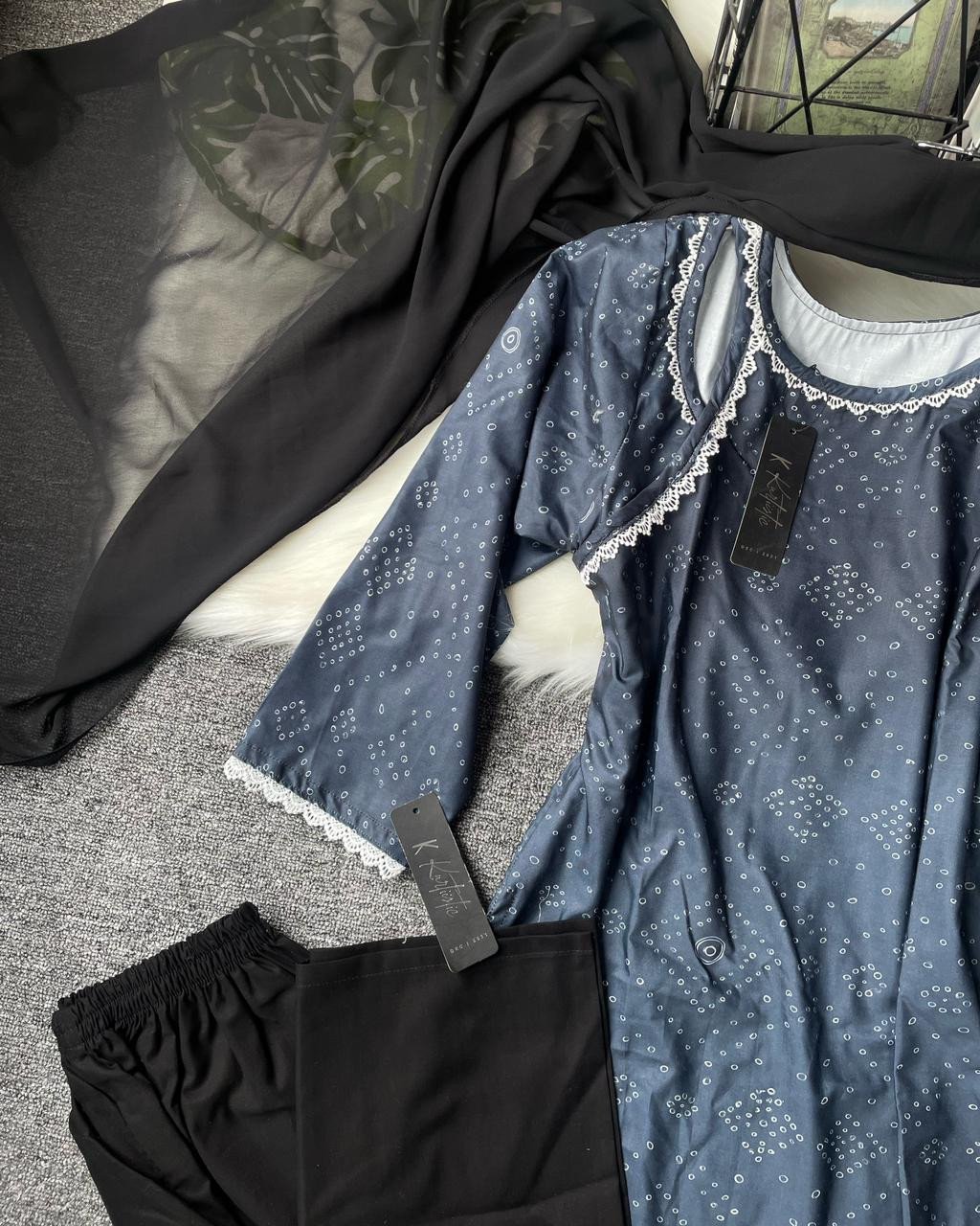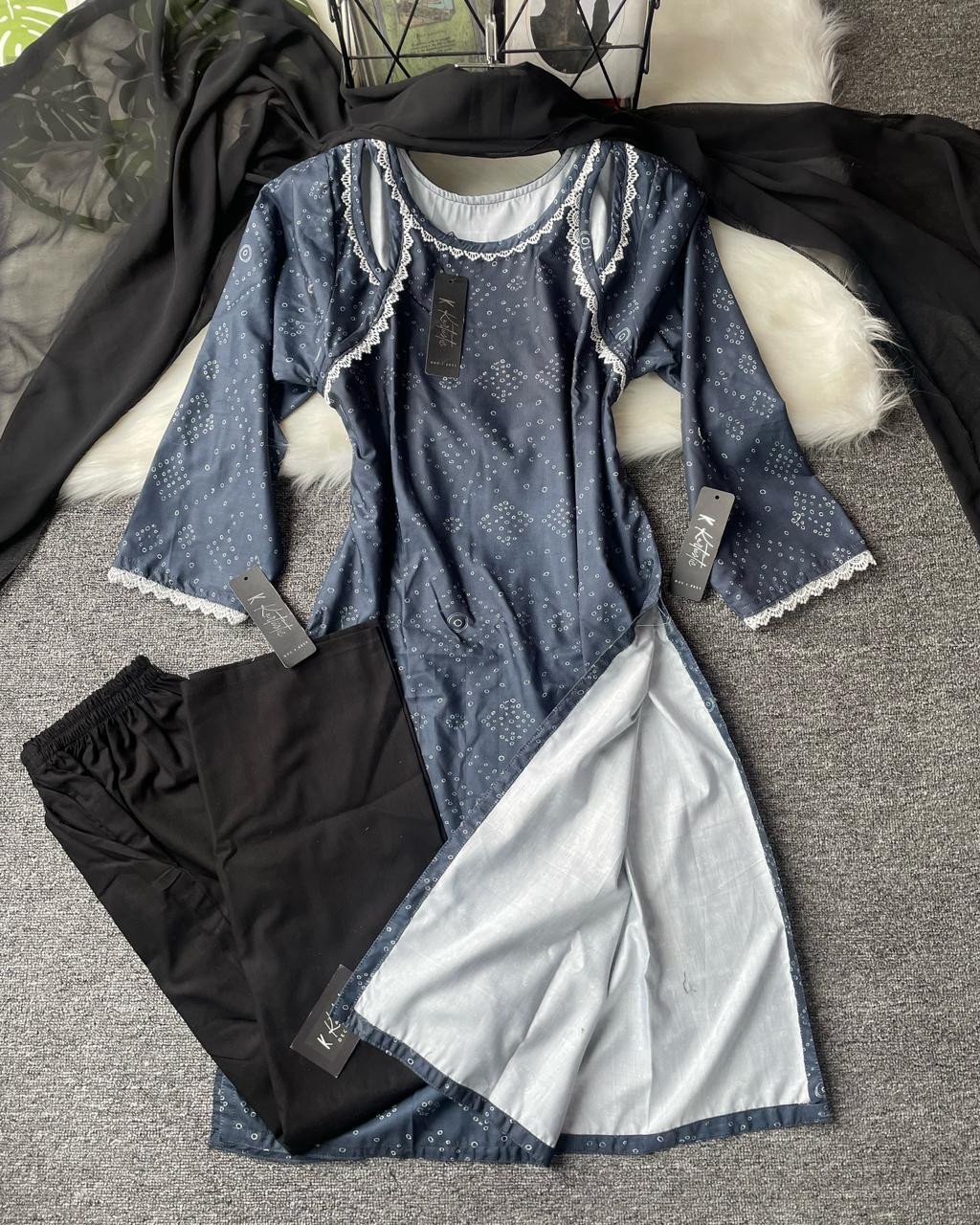 This blend cotton set perfectly captures Kurtiistic’s philosophy: style that speaks of simplicity, elegance, and comfort. The combination of minimal prints, lace borders, and flowy black dupatta makes it both fashionable and functional.