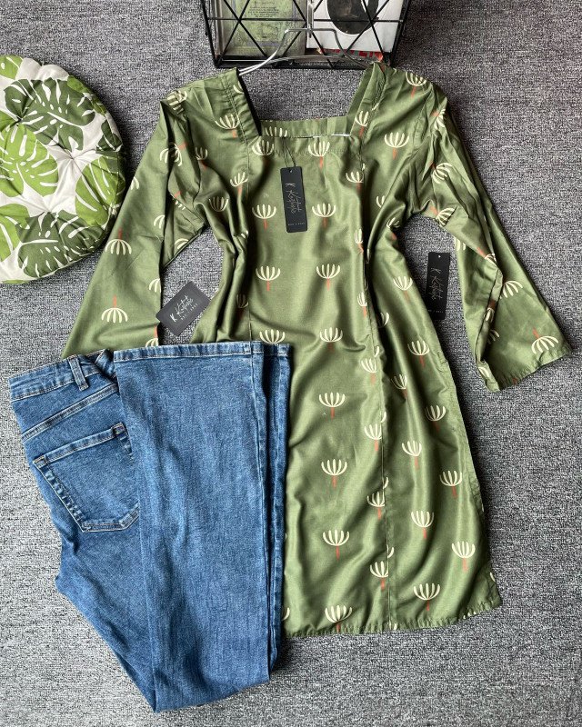 kurtiistic blend cotton kurti W/ jeans - Olive green