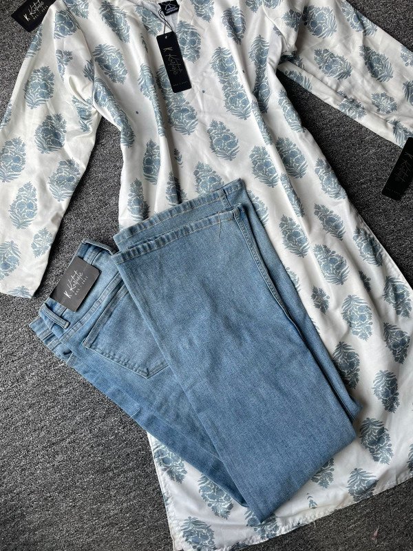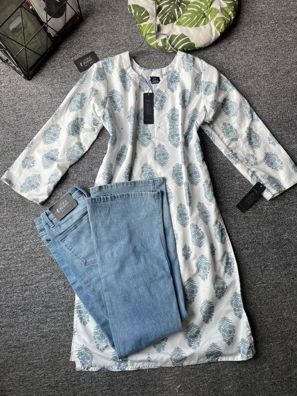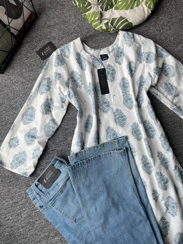 kurtiistic blend cotton kurti W/ jeans - (Off-white / cream base with soft sky-blue floral motifs)
