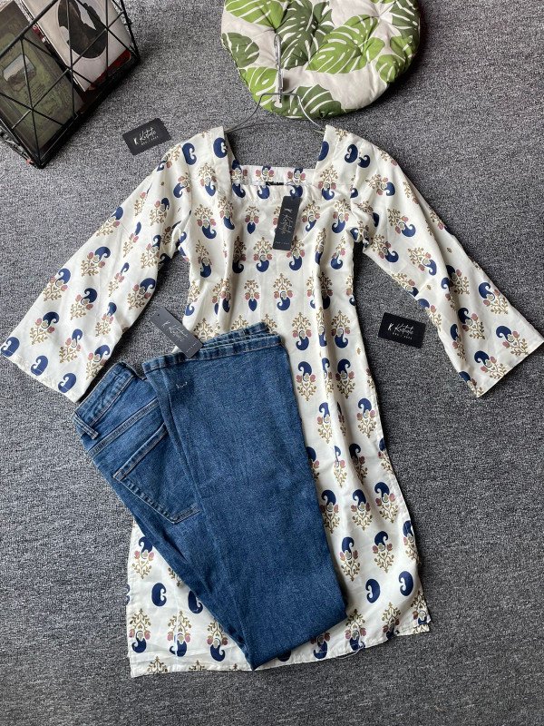 kurtiistic blend cotton kurti W/ jeans - (Off-White with Navy & Golden Motif Print)
