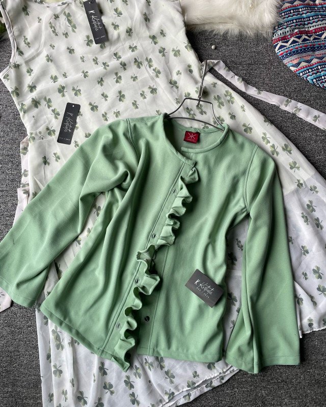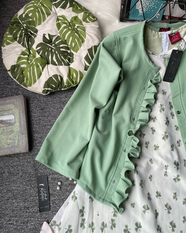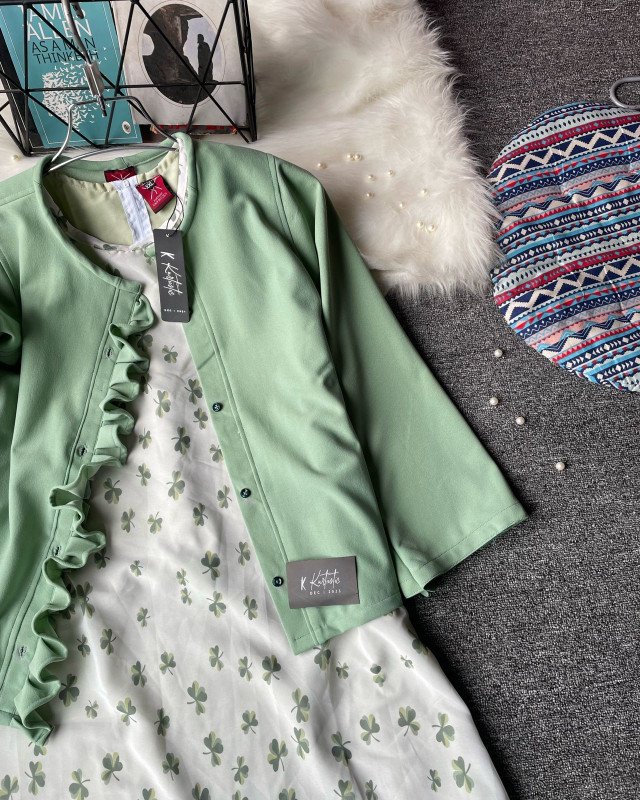 kurtiistic SERENA series | Winter special suite - sage-green floral print, paired with a solid pastel sage-green ruffle knit overlay top.