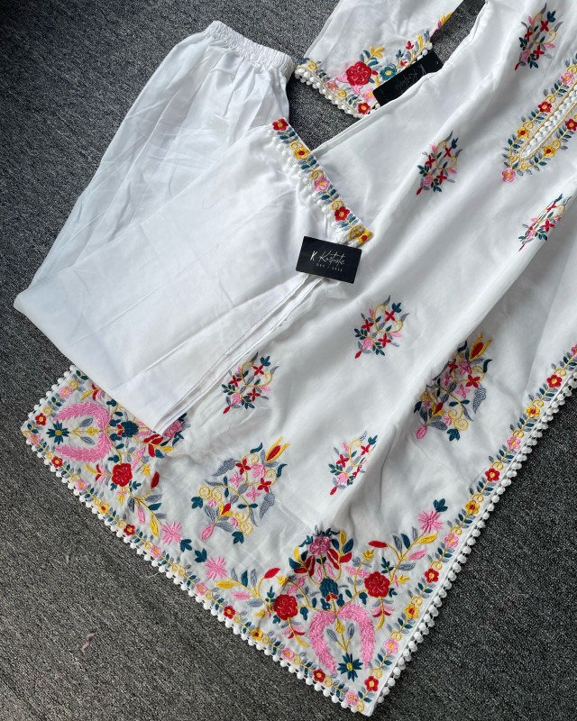 The “RONGON” White Co-ord is perfect for daytime wear, lunch dates, festive gatherings, or casual celebrations. It embodies a cheerful, positive aura that instantly brightens your look while keeping things simple and sophisticated. The lightweight nature of the fabric makes it ideal for warm weather, while the detailed embroidery gives it a rich, ethnic charm.