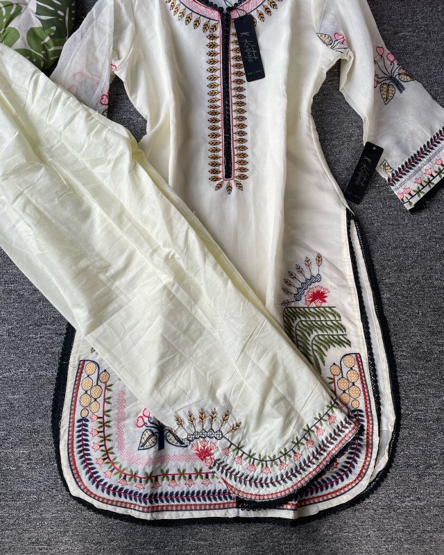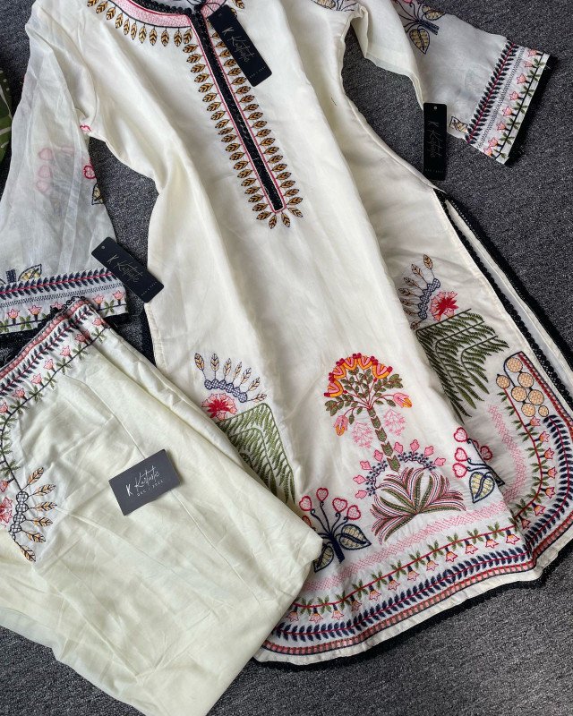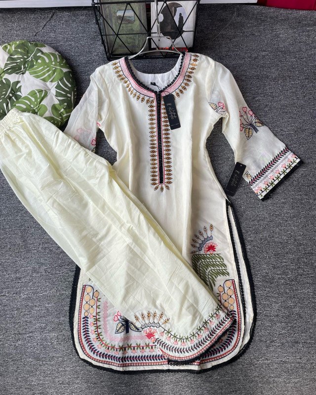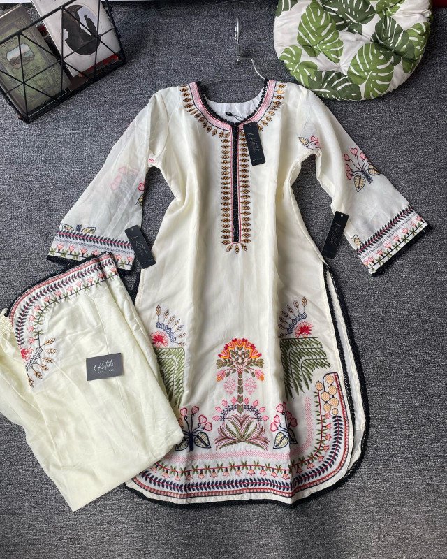 What makes this co-ord truly stand out is its multicolor thread embroidery on the neckline, sleeves, and hemline. The embroidery patterns are inspired by nature — filled with floral and leafy designs in soft pink, mustard, olive, and black shades. These colors sit beautifully against the off-white background, creating a calm, luxurious contrast. The design is neither too bold nor too plain — it’s the perfect blend of modern elegance and traditional detailing.