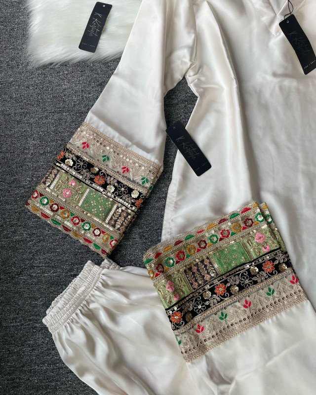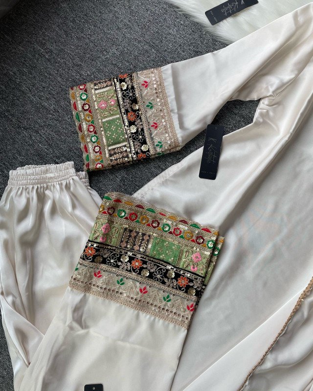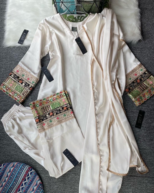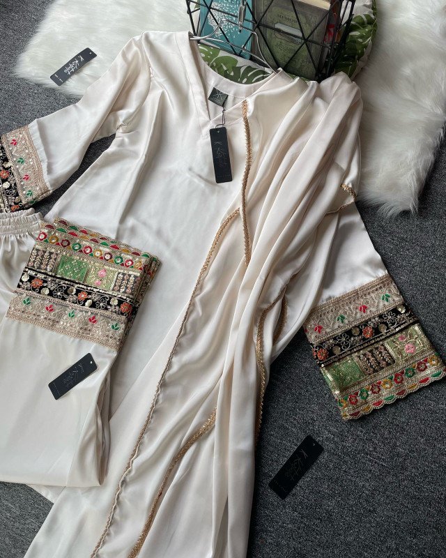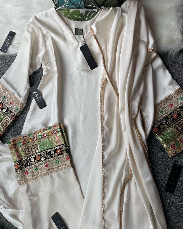 ( creamy off white ) Kurtiistic Eid Collection - 04 | Premium Dubai Silk Fabric three piece set