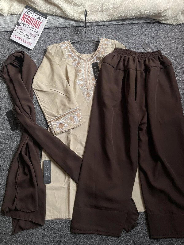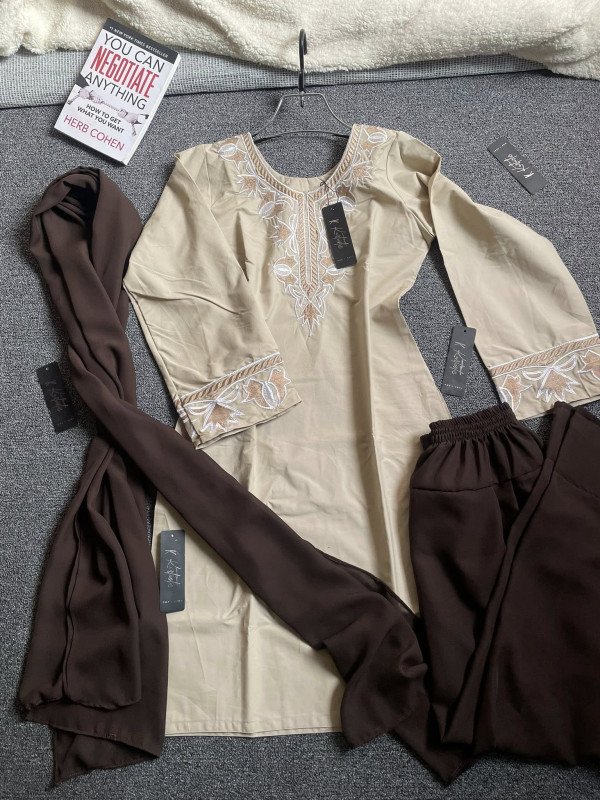 100% Pure Cotton Embroidery Minimalist Kameez with Farshi Shalwar & Dupatta