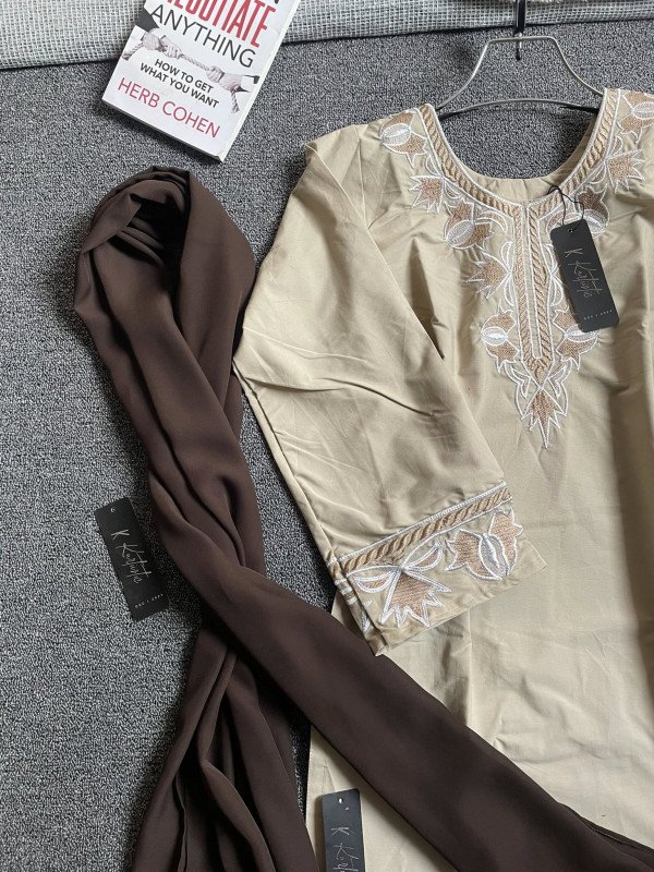 The sleeves also include matching embroidery, maintaining harmony in design.