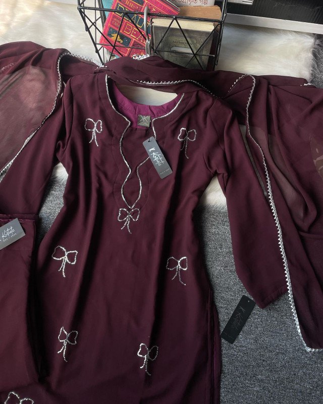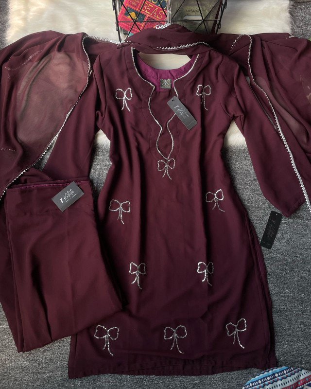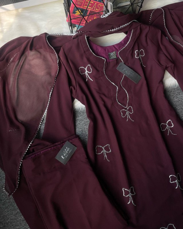( Deep Maroon ) - Kurtiistic New Eid Arrivals – Eid Exclusive Stone Work “Pookie Designed” Georgette Three Piece Set