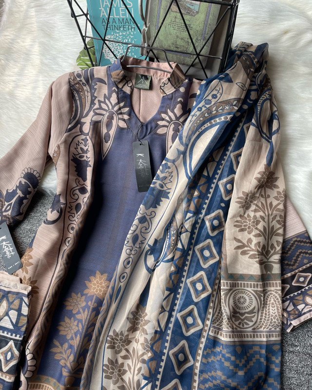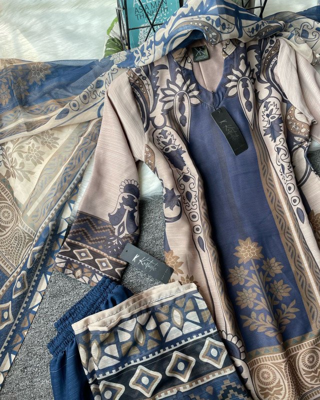 This Denim Blue Serenity three-piece set is designed for women who value comfort, subtle luxury, and timeless fashion. Its soothing colors, elegant prints, and breathable fabric make it a perfect choice for everyday elegance and refined occasions.