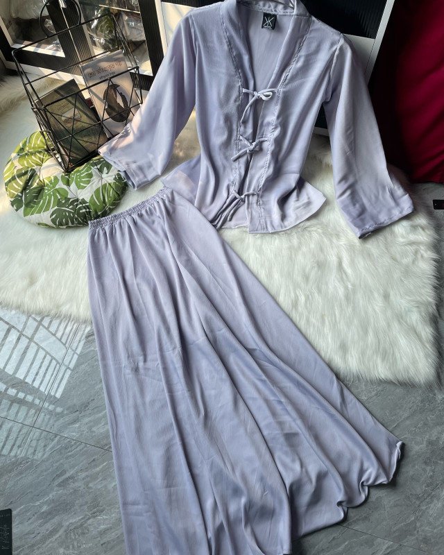 ✨ In summary, this outfit combines aesthetic elegance, premium-quality fabric, and functional comfort. Its subtle color, oriental-inspired tie-knot detailing, and flowing structure make it a refined choice for modern women who value both style and comfort.