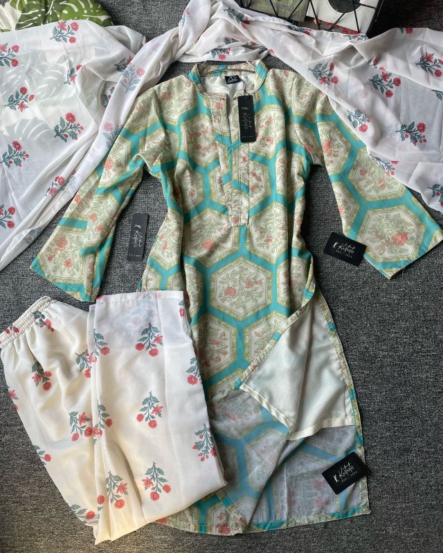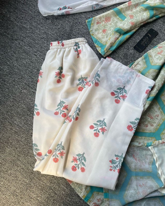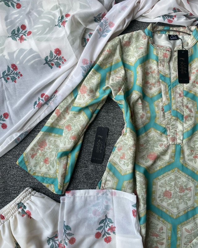 Each piece of the Grace Set — Kameez, Pant & Orna — has been carefully crafted from premium printed georgette fabric. The material is soft, lightweight, and breathable, making it ideal for both daytime wear and evening gatherings.