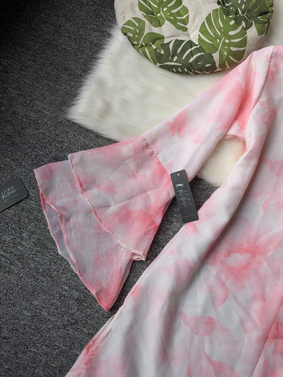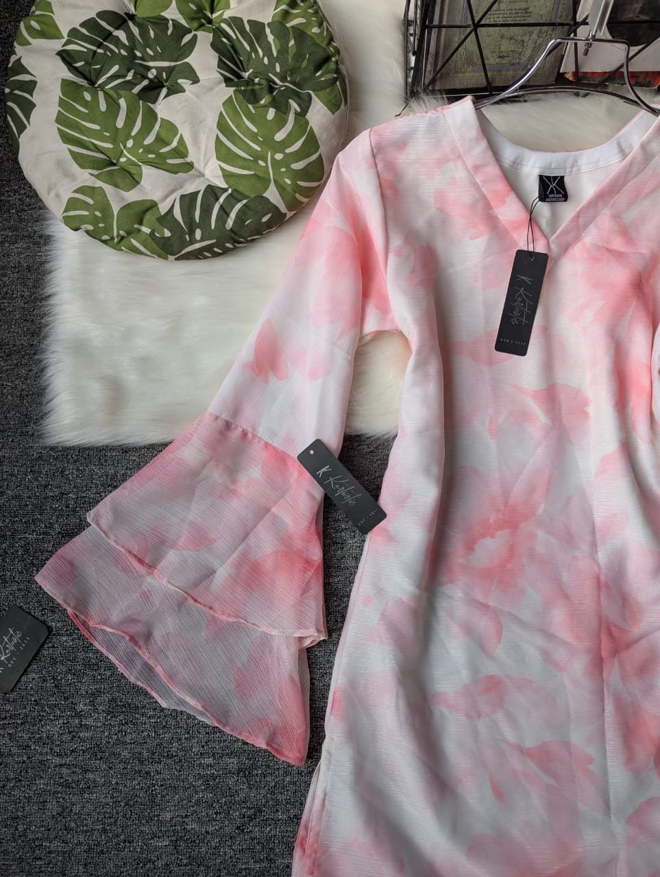 The top features a Layered Flared Bell Sleeve design that gracefully falls from the elbow, creating a dreamy silhouette that moves with you. Each layer of the sleeve has been carefully crafted to maintain a balanced flare — light, soft, and flowy — giving your look a subtle touch of drama while staying feminine and classy.