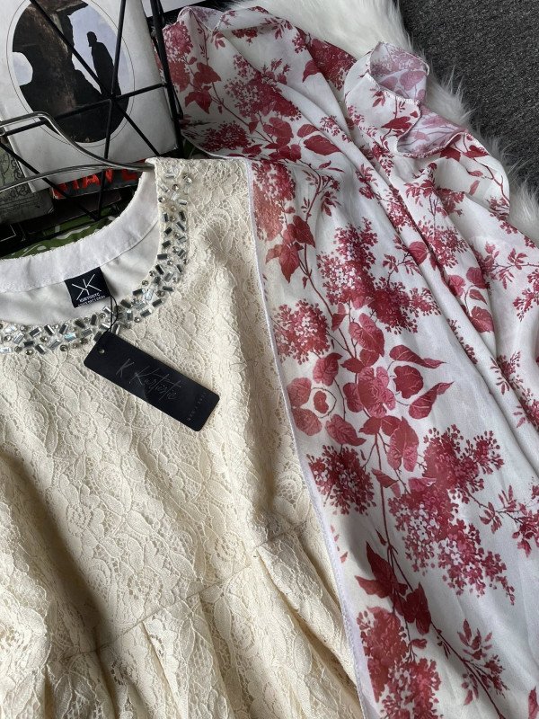kurtiistic new emboidery and stone work gown with maroon dupatta