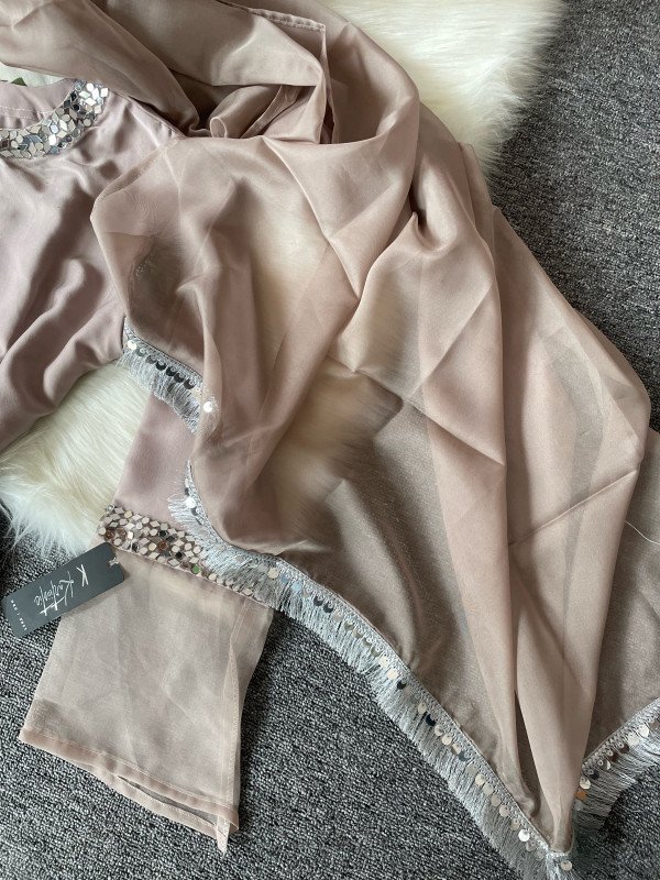 We used premium thick silk fabric for the kameez and salwar & we did glass work on the neck and the sleeves of the kameez. Dupatta is made with Soft Organza fabric ( Dupatta fabric might get changed in another stock)