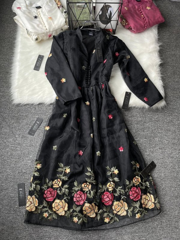 This gown is made with a premium organza outer layer and a soft butter silk inner lining for comfort and elegance. The organza gives a light, flowing effect, while the butter silk inside feels smooth on the skin. It features delicate floral embroidery all over, with rich multicolored rose embroidery along the hemline. Designed with a round neckline, front button detailing, and full embroidered sleeves, it offers a graceful silhouette. The gathered waist creates a beautiful flare, and the gown length is approximately 46–47 inches, making it perfect for festive events, parties, and special occasions.