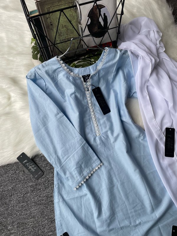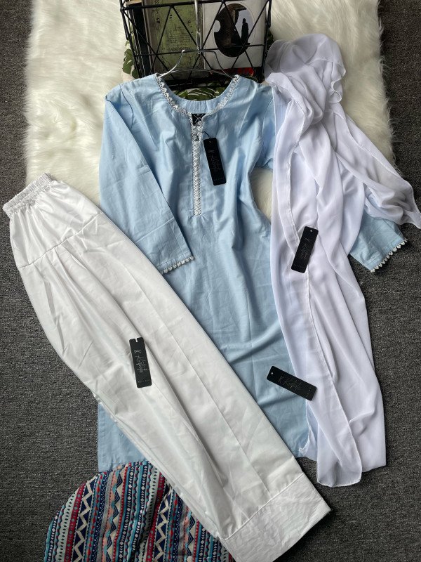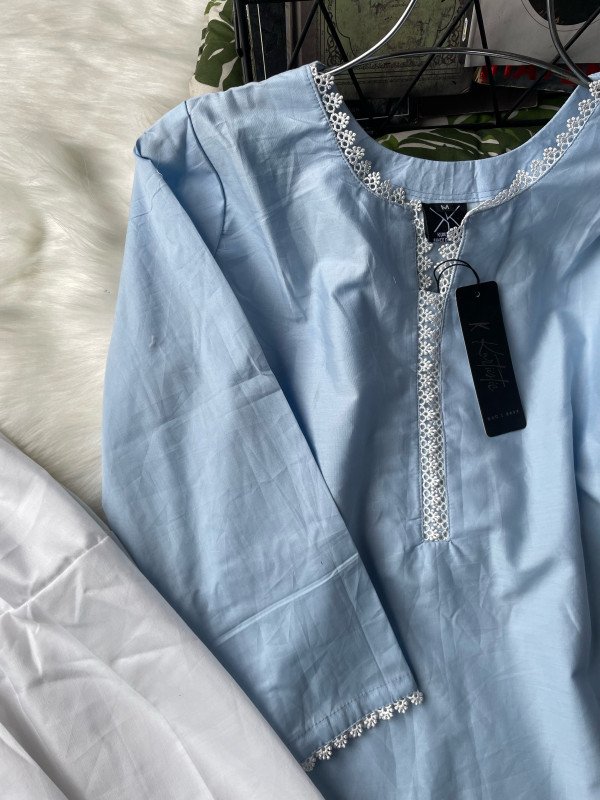 Kurtiistic solid sky three piece set with FARSHI SHALWAR