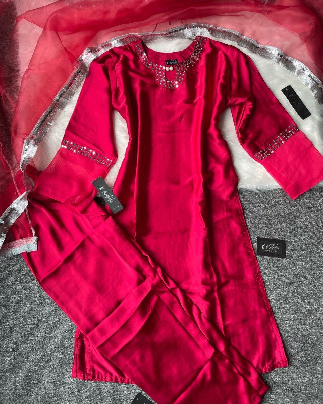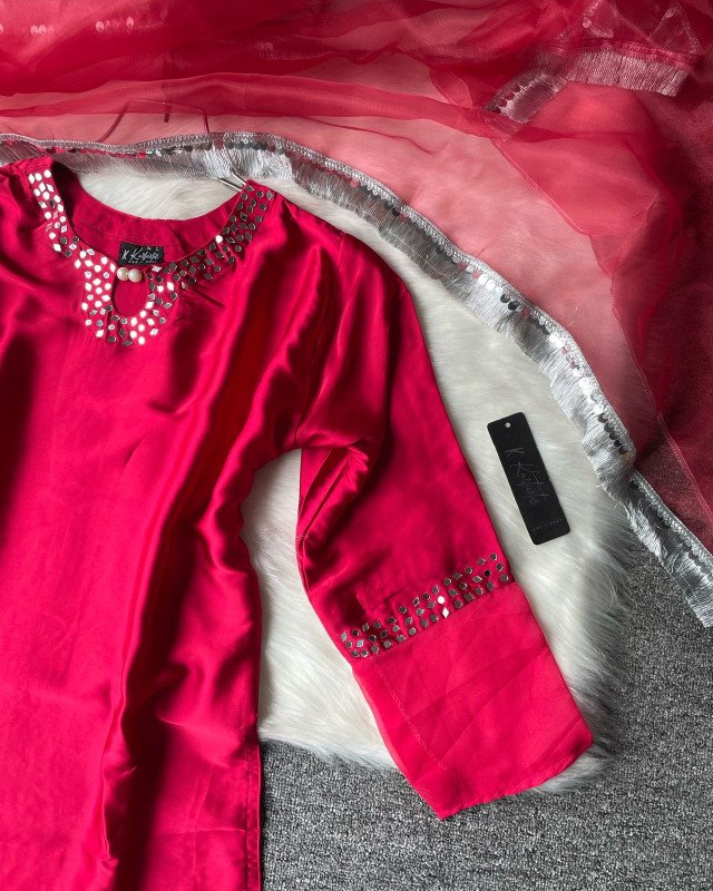 • Kameez & Pant: Made from high-quality silk fabric, the body of the kameez offers a smooth, lustrous finish that adds a graceful fall and rich texture. The minimal yet captivating mirror work embellishment around the neckline and sleeve cuffs creates a stunning reflection under light—adding just the right touch of festive sparkle.
