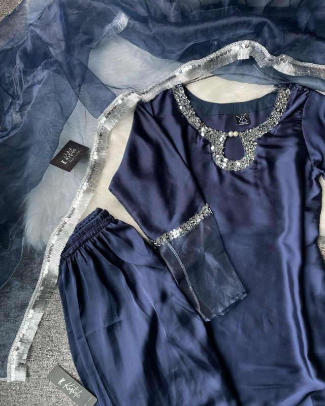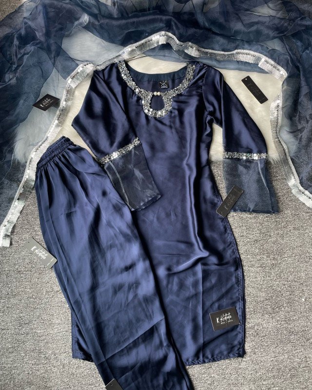 This elegant three-piece set is crafted with a luxurious combination of premium silk and soft organza, designed to bring both comfort and sophistication in every wear.