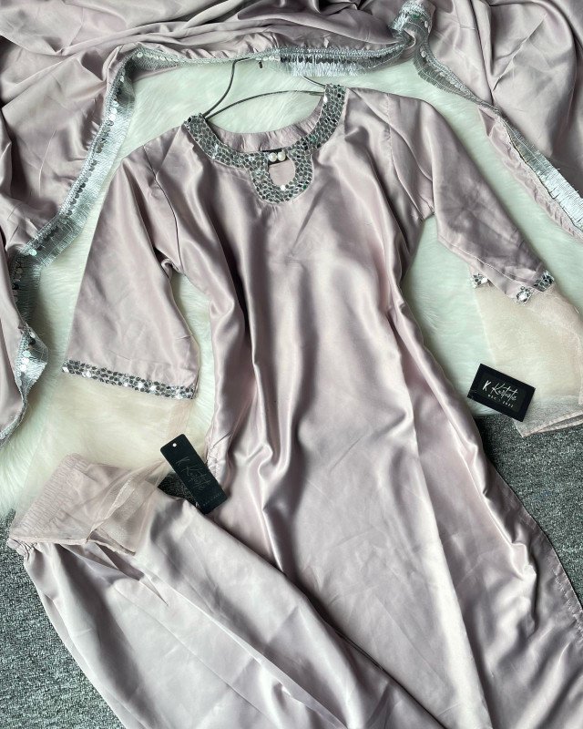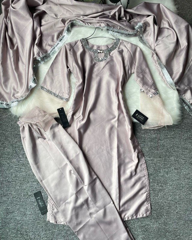 This elegant three-piece set is crafted with a luxurious combination of premium silk and soft organza, designed to bring both comfort and sophistication in every wear.