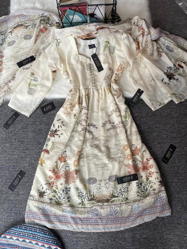 We used premium weightless georgette printed fabric for the gown & single butter fabric for the inner. Also we used same fabric for the dupatta.