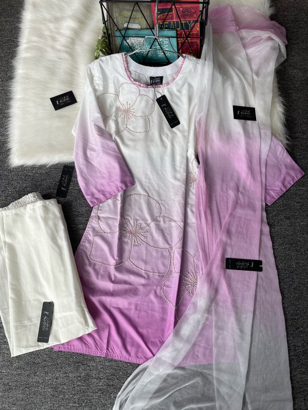 Pink shades and sky shades with floral pearls work three piece set only available at - Kurtiistic.