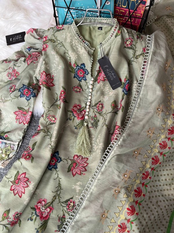 Yumna Zaidi inspired - ever green. fabric & details : we used see through digital printed machang fabric and used butter fabric for the inner part. pant - butter fabric. dupatta - digital printed machange. sizes ~ bust : 34 - 44 all size available. / length: 37/38. pant length: 38/39 pant waist : FREE SIZE> Price is only 1350 Tk for now ( price will be increased) প্রোডাক্ট দেখতে ছবিতে যেমন দেখছেন সেম তেমনই হবে। পছন্দ না হলে ডেলিভারি ম্যানকে রিটার্ন করে দিতে পারবেন ।
