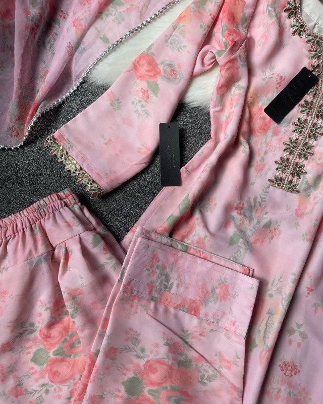 We used premium weightless digital printed georgette for the kameez pant and dupatta & we used butter fabric for the kameez and pant inner. Dupatta has silver-white lace work all over the corners. And the kameez has premium lace work on the neck and sleeves.