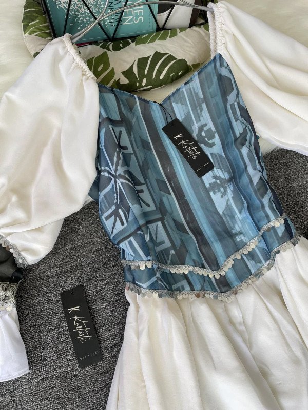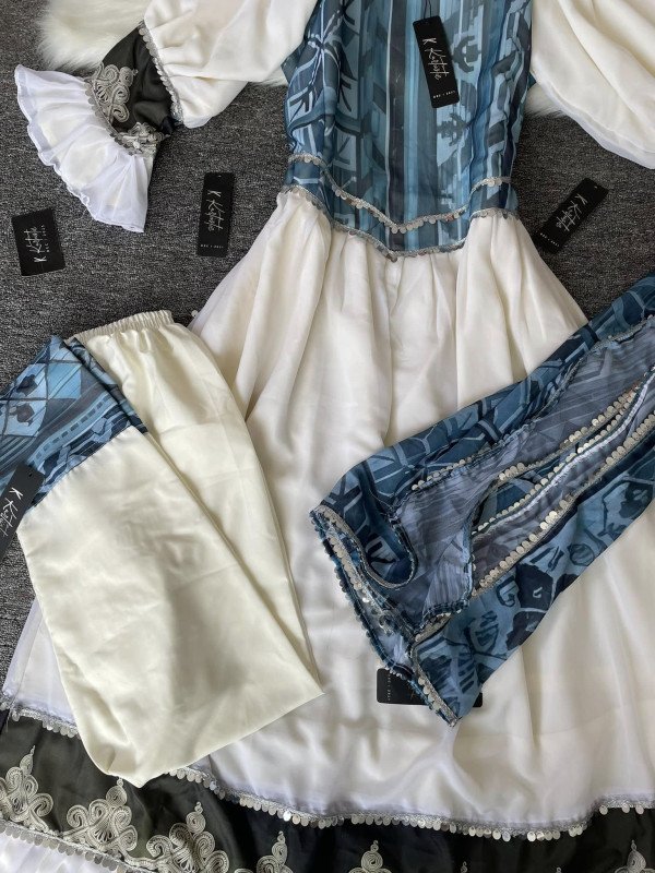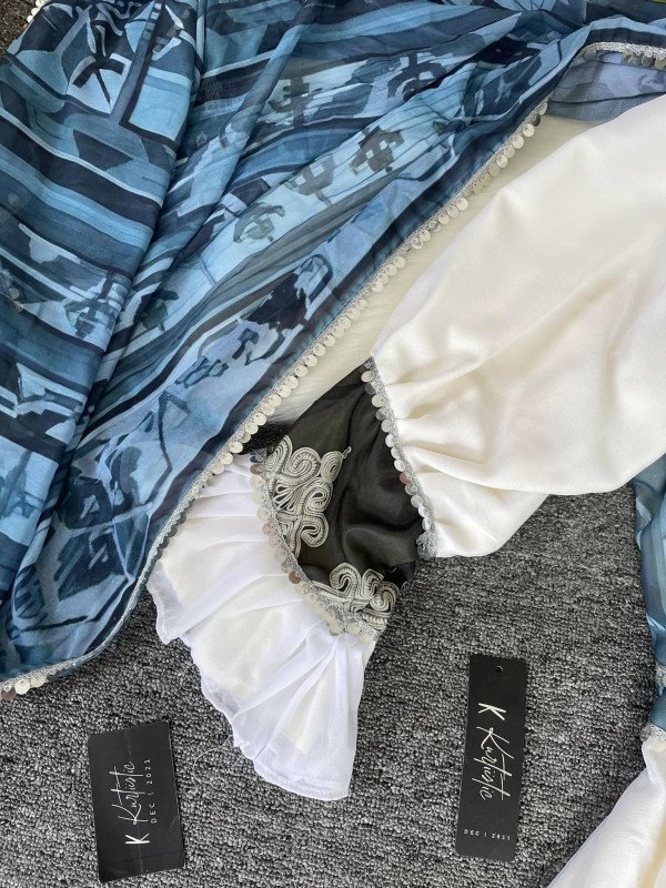 We used premium print georgette fabric for the upper part of the body and lower part is with solid weightless georgette fabric. We used butter fabric for the inner & pant is also made with butter fabric and have georgette lace design on it. Dupatta is made with Premium weightless georgette fabric & it has lace work on the borders.