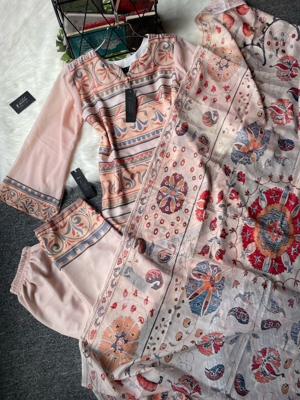We used premium weightless georgette fabric for kameez and pant ( digital printed ) & we used single butter fabric for the inner only. Duppatta is also made with digital printed Weightless georgette.