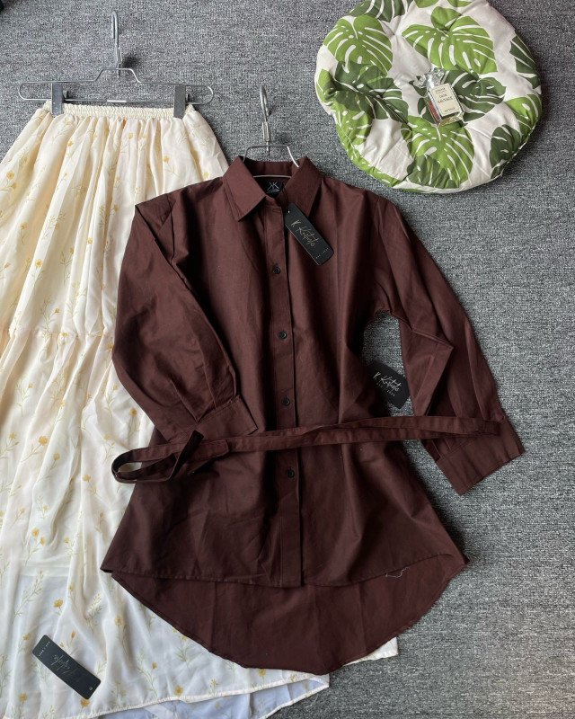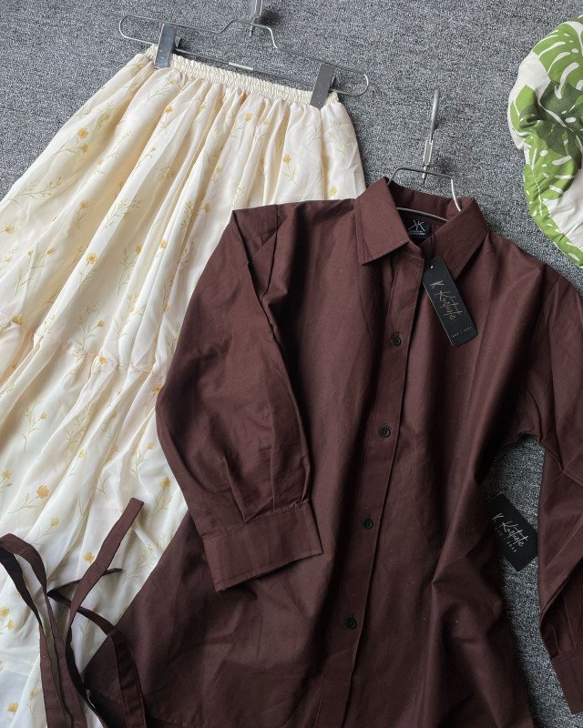 The outfit features a rich brown cotton shirt paired with a soft digital-printed georgette skirt, making it a balanced fusion of boldness and softness. The brown shirt gives a refined, grounded tone that perfectly complements the light ivory floral skirt, creating a look that’s both timeless and trendy. The shirt is tailored with a longer back (34 inches) and front length of 28 inches, giving a flattering high-low silhouette that suits all body types. With full sleeves and breathable cotton fabric, it ensures all-day comfort while maintaining a classy appearance.