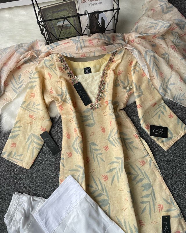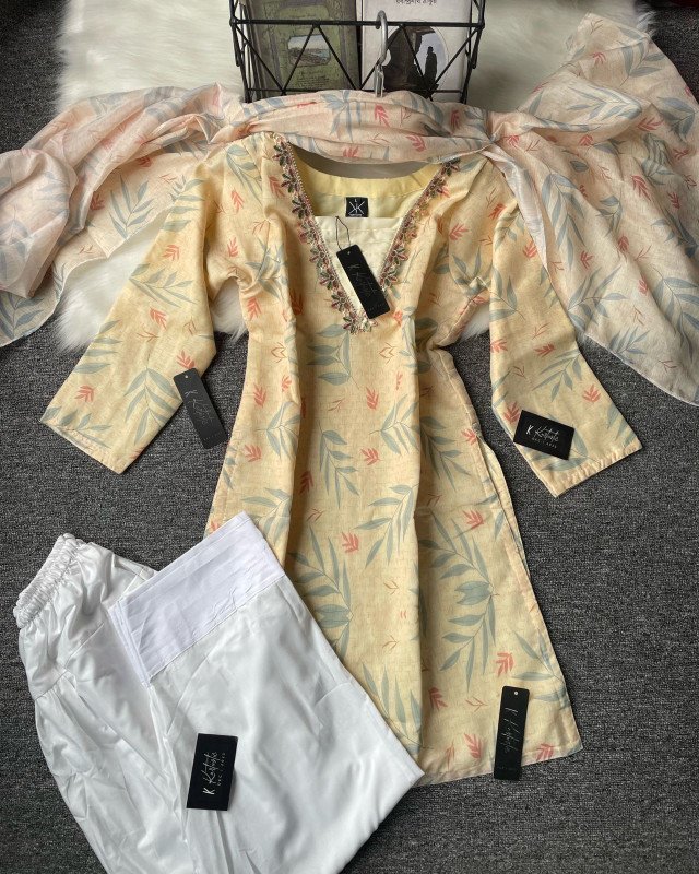 The sleeves are kept three-quarter length, balancing practicality with style. The straight-cut silhouette makes it versatile for different body shapes, providing a naturally flattering look. The trouser, in pure white cotton, creates a crisp contrast with the beige printed kameez. The dupatta mirrors the leafy prints, completing the set with harmony and elegance.