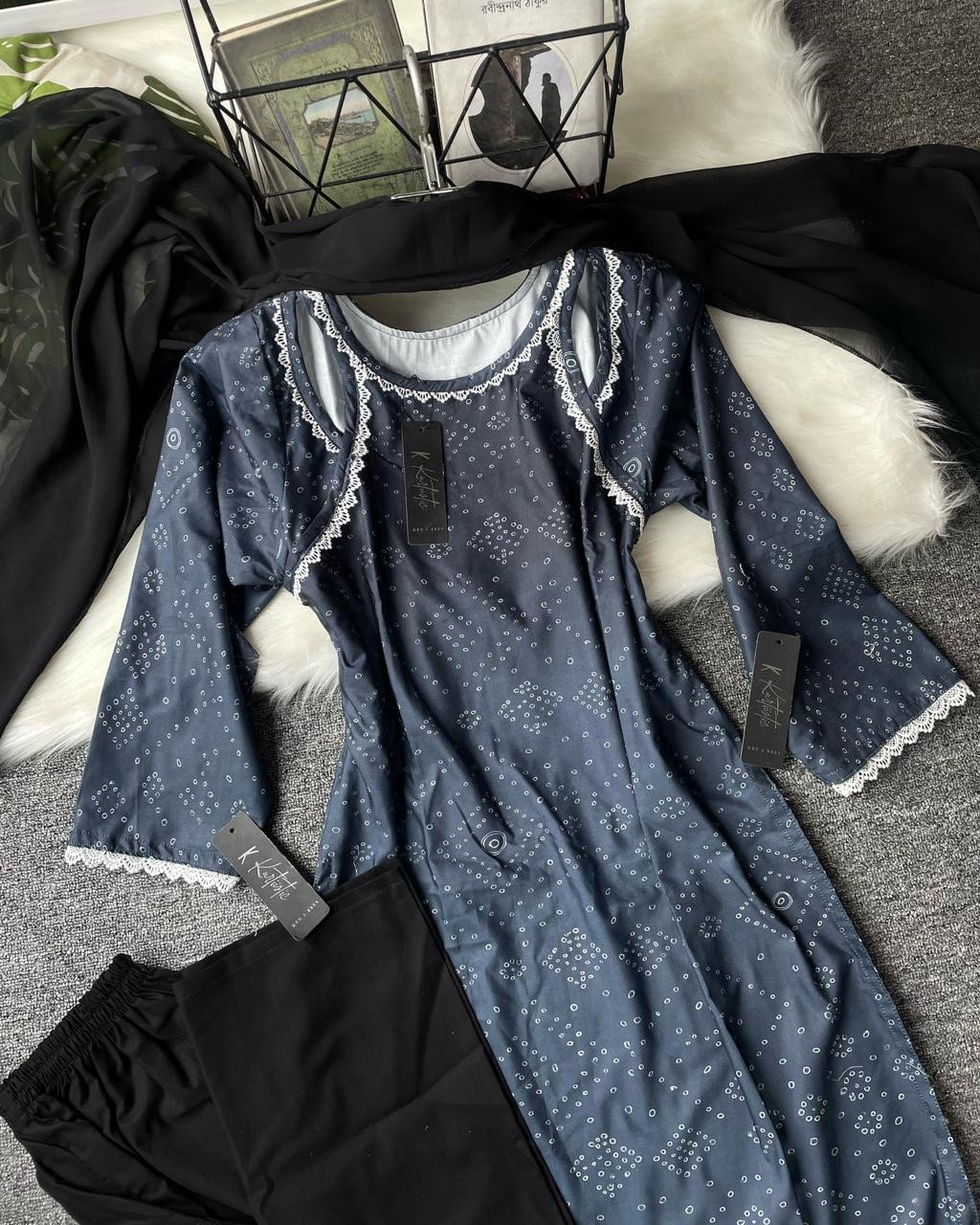 This blend cotton set perfectly captures Kurtiistic’s philosophy: style that speaks of simplicity, elegance, and comfort. The combination of minimal prints, lace borders, and flowy black dupatta makes it both fashionable and functional.