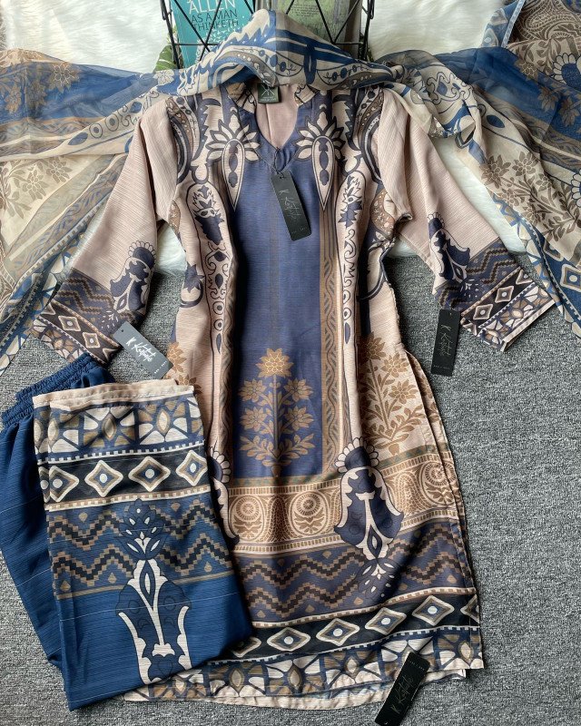 This Denim Blue Serenity three-piece set is designed for women who value comfort, subtle luxury, and timeless fashion. Its soothing colors, elegant prints, and breathable fabric make it a perfect choice for everyday elegance and refined occasions.