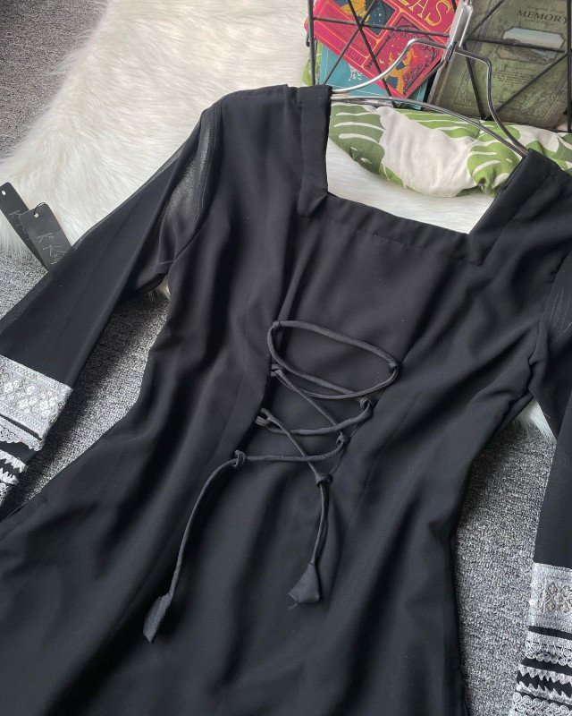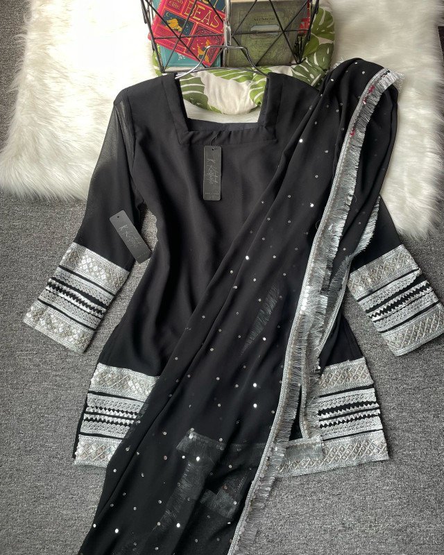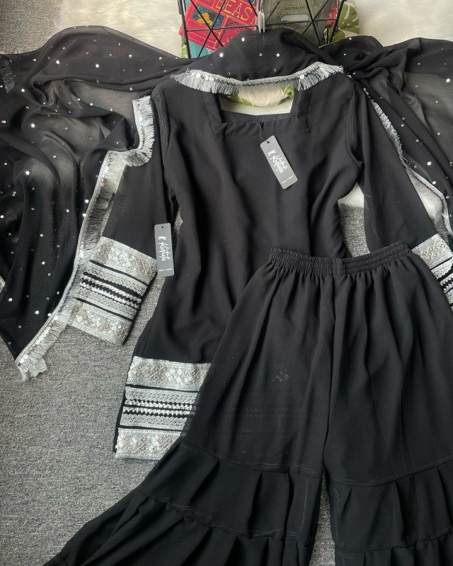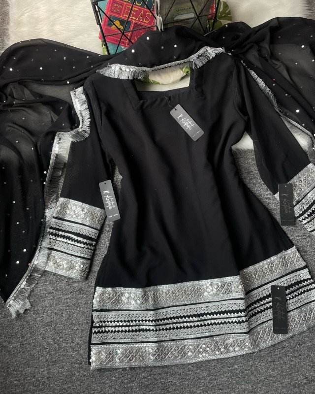 (BLACK) kurtiistic Eid Collection : ( 06 ) Kurti with ruffled palazzo-style pants ( wide - leg pants ) with all over mirror & lace work gorgeous dupatta.