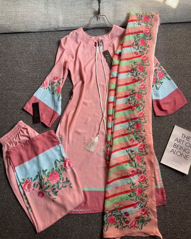 The design of this Eid three-piece set is inspired by festive elegance and everyday wearability. The silhouette is kept graceful yet comfortable, making it suitable for long Eid days—from morning prayers to evening celebrations.