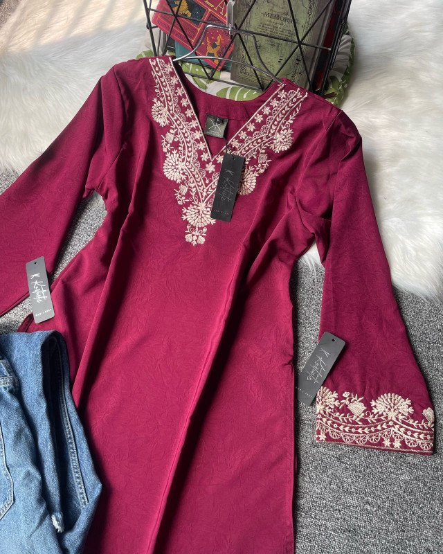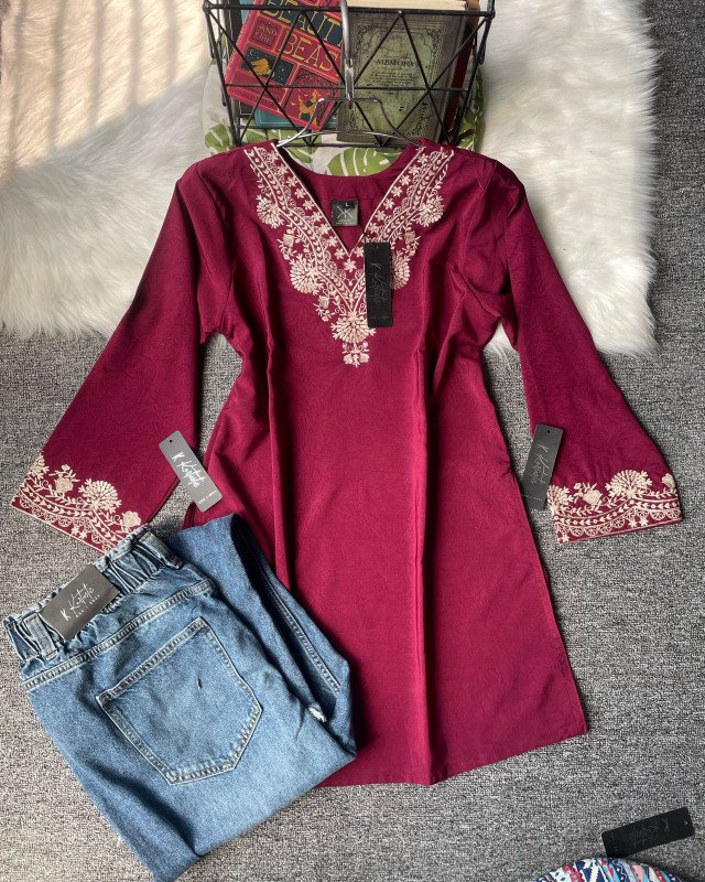 Kurtiistic New Arrivals: (“Cherry Wine) Premium Embroidery Short Kurti with Jeans
