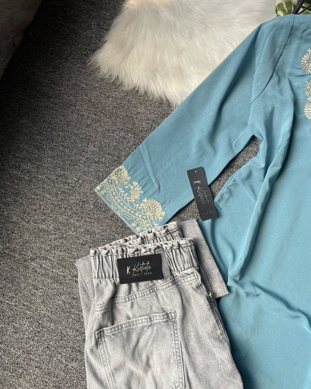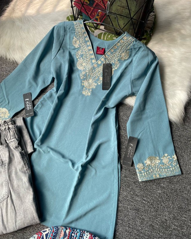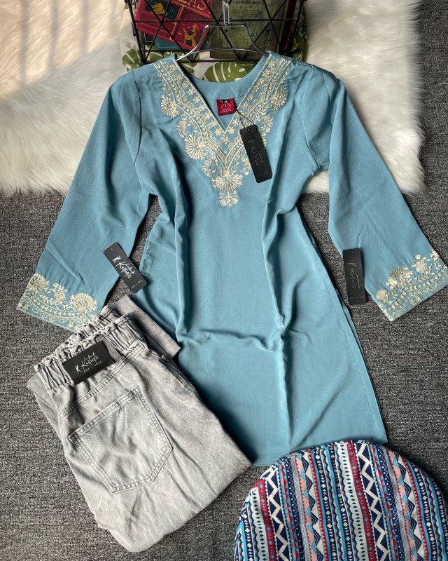Kurtiistic New Arrivals: (dusty teal / muted aqua blue) Premium Embroidery Short Kurti with Jeans
