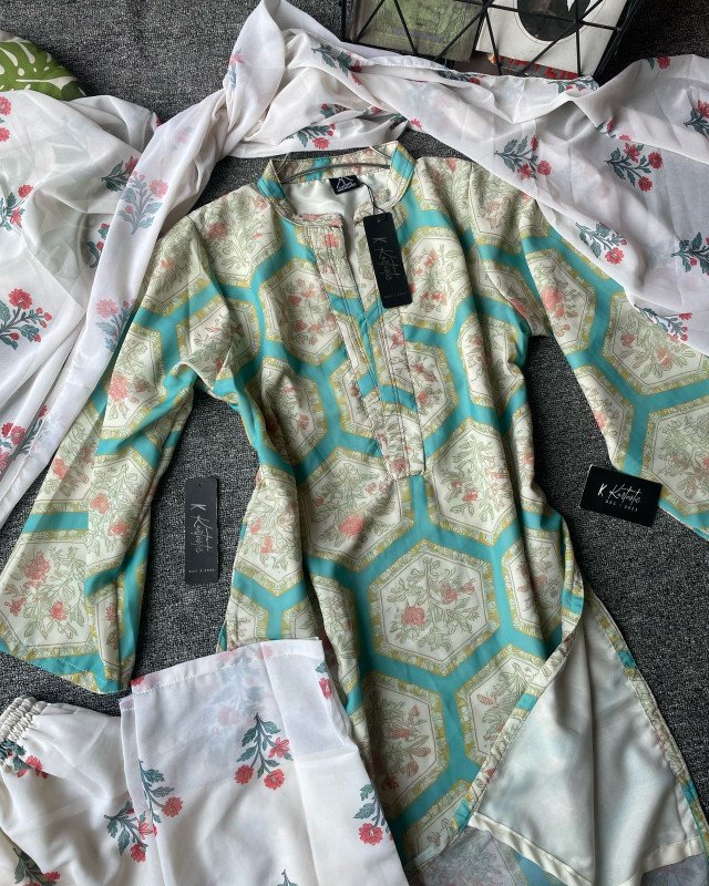 Every print is digitally developed with precision, maintaining high-definition sharpness and color accuracy. Whether under sunlight or indoor lighting, the outfit reflects a subtle sheen and refreshing charm.