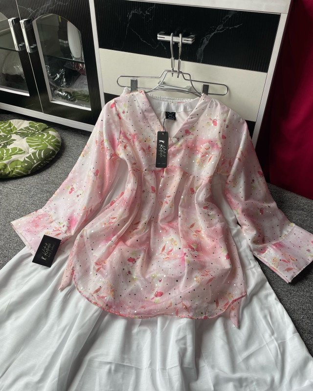 The top of Mohua is made from premium georgette fabric, chosen for its lightweight and flowy texture. Printed with delicate pastel floral motifs, the kurti celebrates softness and femininity. To elevate its look, it features intricate mirror-like foil work (ayna touch), carefully scattered across the fabric. This subtle sparkle creates an old-money aesthetic, perfect for anyone who wants a rich and graceful appearance without being too loud.