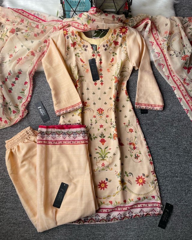 Eid is a celebration of joy, togetherness, and timeless elegance—and the Soft Peach Beige Kurtiistic Eid Collection is designed to reflect exactly that. This premium printed three piece set has been thoughtfully created for women who value refined style, superior comfort, and long-lasting quality. More than just an outfit, it is a graceful expression of festive sophistication, made to help you feel confident, comfortable, and beautifully dressed throughout the special days of Eid.