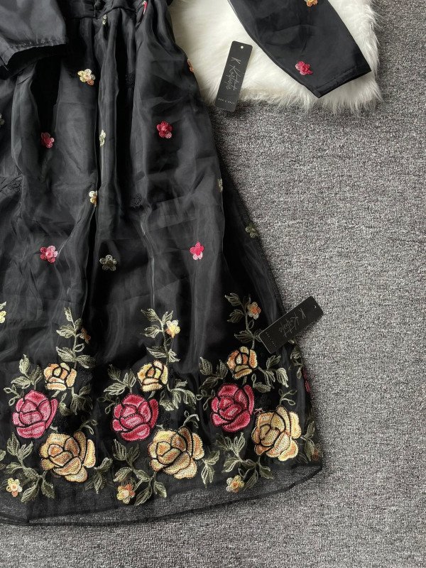 This gown is made with a premium organza outer layer and a soft butter silk inner lining for comfort and elegance. The organza gives a light, flowing effect, while the butter silk inside feels smooth on the skin. It features delicate floral embroidery all over, with rich multicolored rose embroidery along the hemline. Designed with a round neckline, front button detailing, and full embroidered sleeves, it offers a graceful silhouette. The gathered waist creates a beautiful flare, and the gown length is approximately 46–47 inches, making it perfect for festive events, parties, and special occasions.