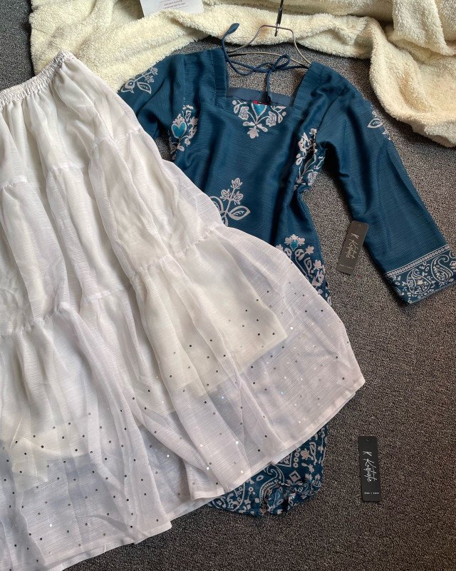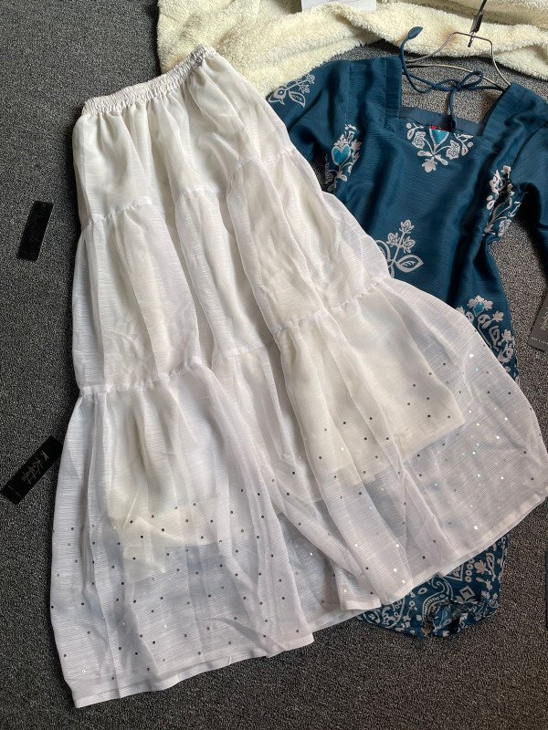 The skirt perfectly complements the kurti, completing the look with elegance and flow.