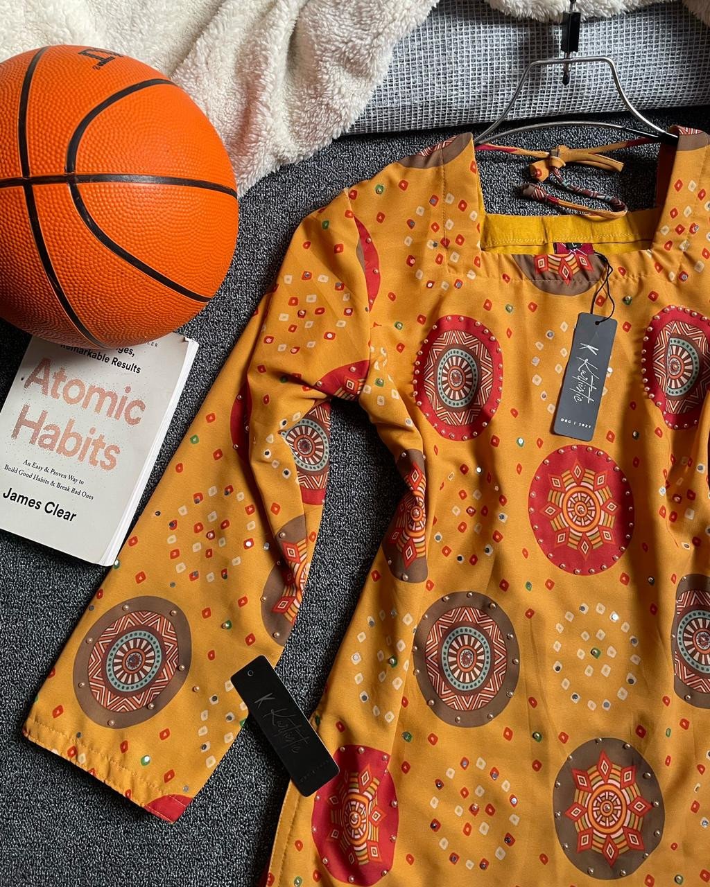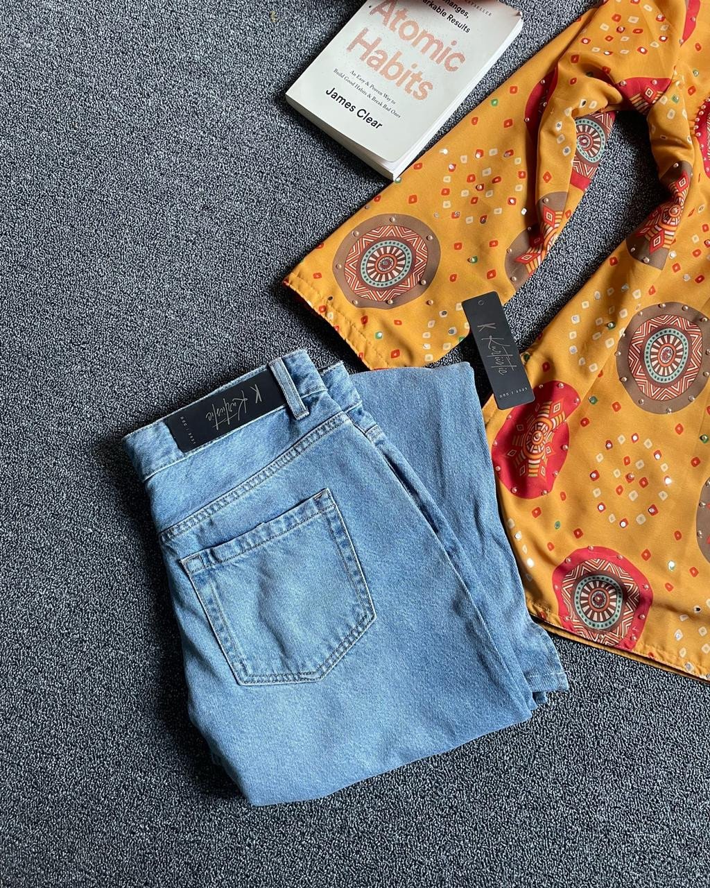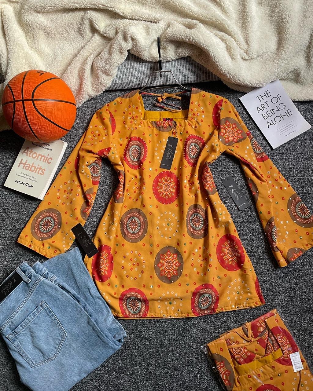 To complete the look, this set includes a well-matched pair of jeans designed to complement the mustard kurti beautifully. The jeans are tailored for comfort and durability, making them a practical addition to your wardrobe.