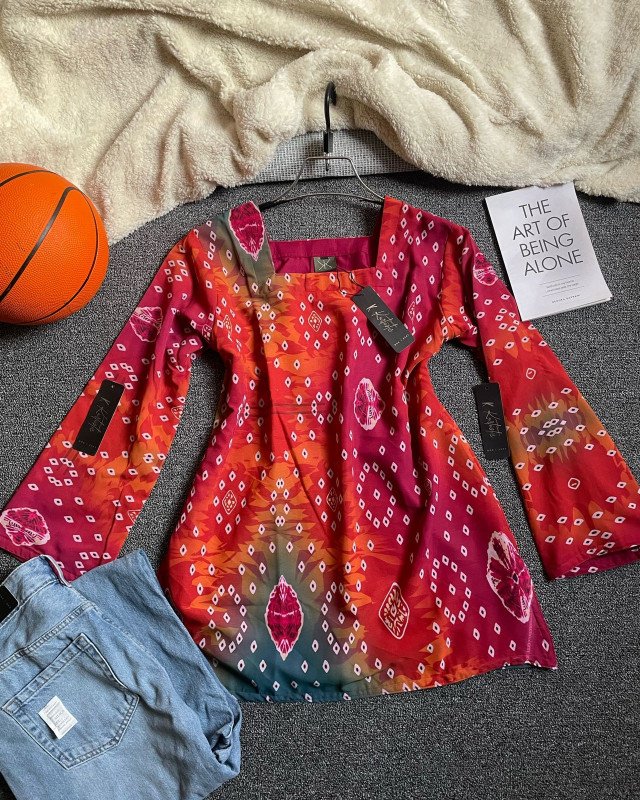 This Vatik Digital Printed Short Kurti & Jeans set represents modern cultural fashion. It is designed for confident women who appreciate artistic prints but prefer contemporary styling. The blend of traditional Vatik aesthetics with a corset back and denim pairing creates a balanced look that feels both rooted and trendy.